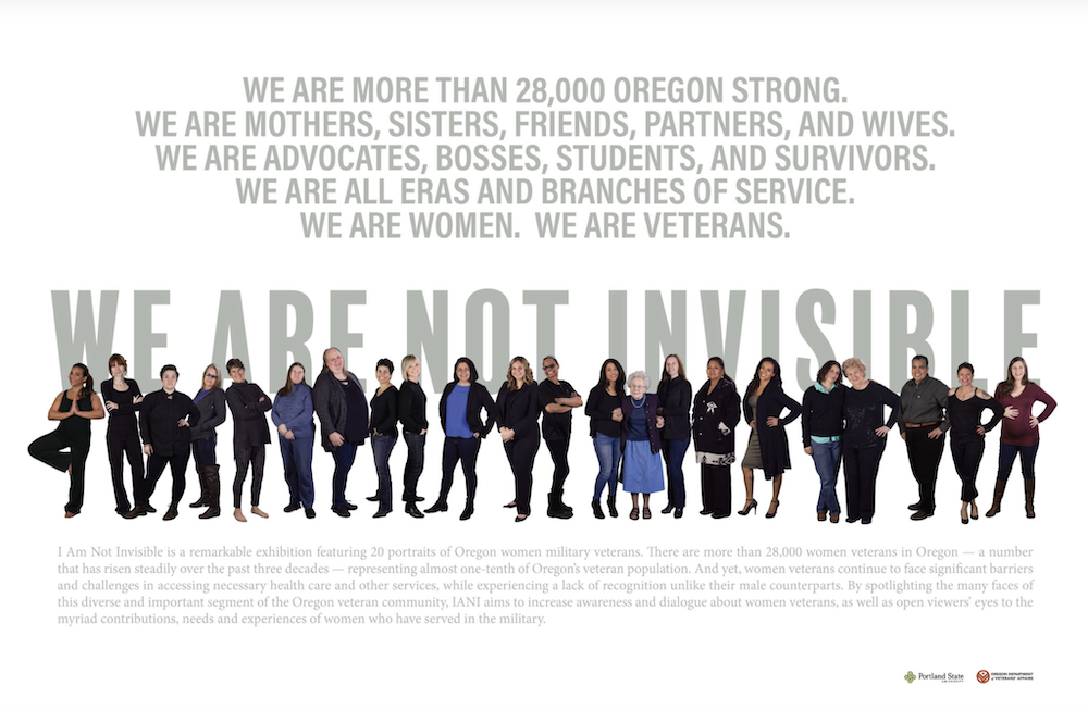 Oregon Department of Veterans’ Affairs “I Am Not Invisible” campaign is a remarkable exhibition featuring 20 portraits of Oregon women military veterans. As described on the Oregon Department of Veterans’ Affairs website,